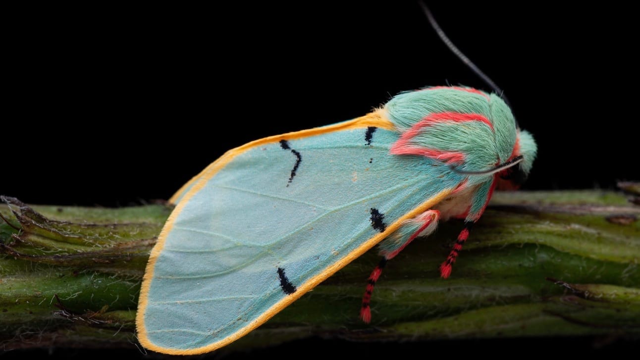 Tiny treasure: the emerald moth of Colombia. Chlorhoda metamelaena, a dazzling moth first described in 1913 by Paul Dognin, is a true gem of Colombia's night sky. Measuring just 11mm, this petite marvel boasts vivid emerald green wings edged with golden borders, showcasing the intricate beauty of nocturnal moths. Each wing features a perfectly consistent pattern, making this tiny creature a stunning example of nature's artistry.