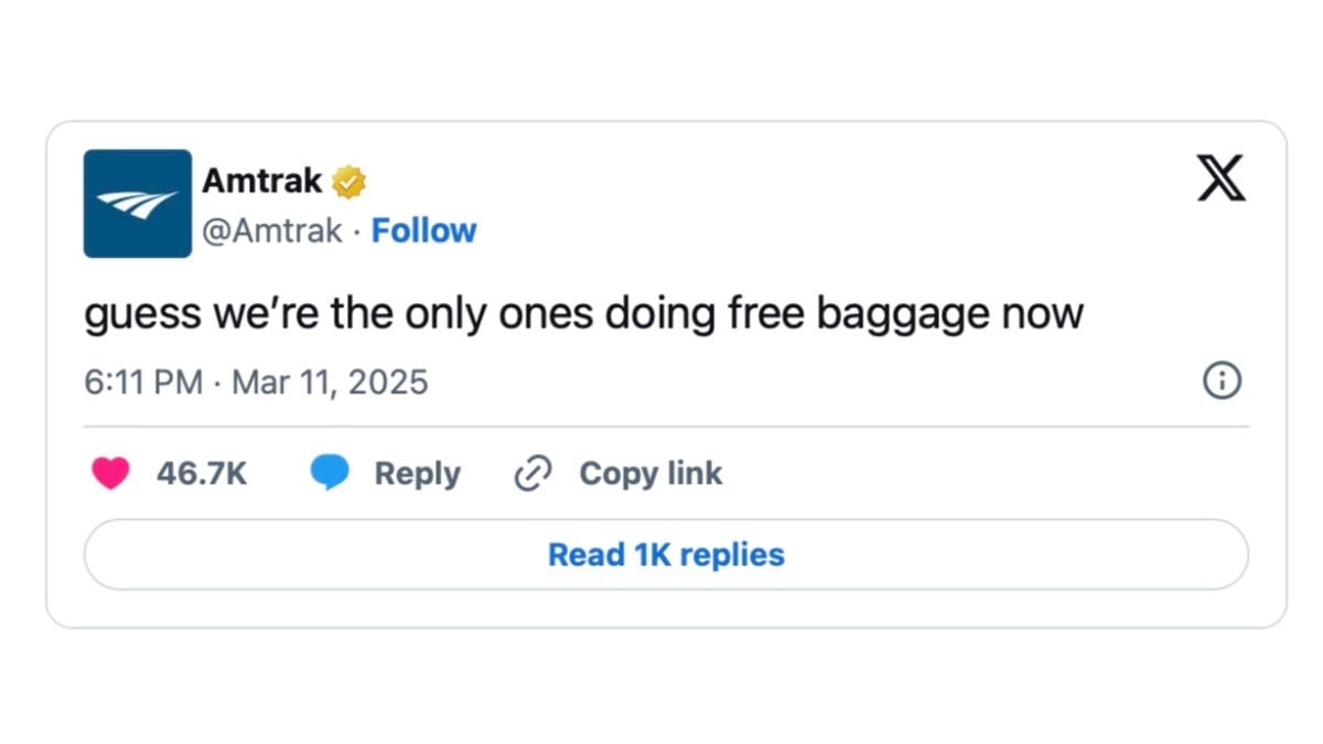 After Southwest Airlines killed its free checked bag policy, Amtrak wasted no time. "Guess we're the only ones doing free baggage now," the train company posted on X, basking in the glory of not being an airline. Unlike most carriers, Amtrak still lets passengers bring one personal item and two carry-ons for free, as long as they stay under weight limits (25 lbs. for personal, 50 lbs. for carry-ons).